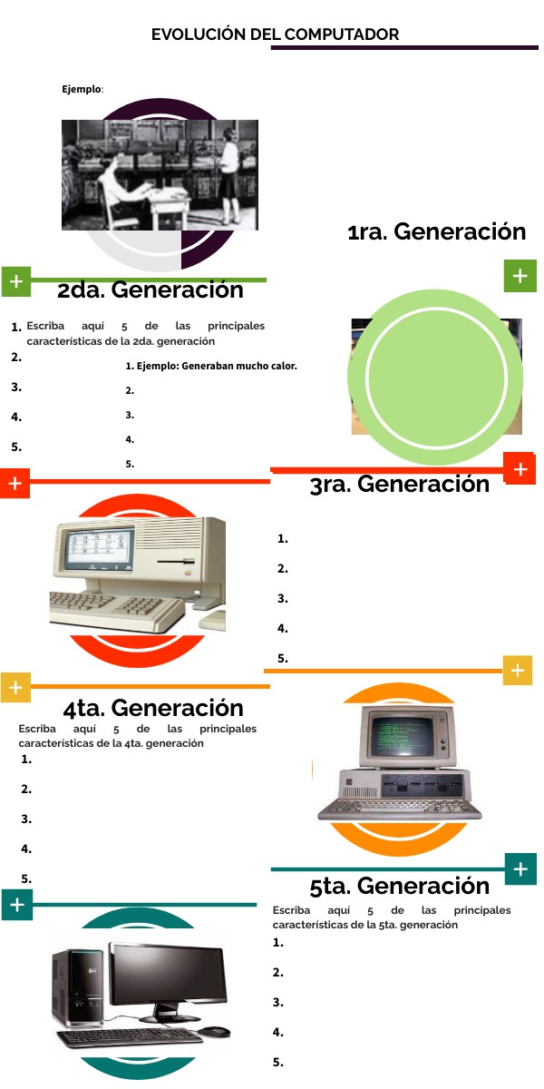 Elija un tipo de computador de acuerdo a la clasificación que se indica en cada recuadro, y enumere cinco caracteristicas. Luego colocar una imagen en el círculo verde.