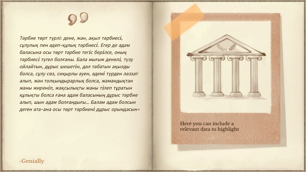Тәрбие төрт түрлі: дене, жан, ақыл тәрбиесi, сұлулық пен әдеп-құлық тәрбиесi. Егер де адам баласына осы төрт тәрбие тегiс берiлсе, оның тәрбиесi түгел болғаны. Бала мығым денелi, түзу ойлайтын, дұрыс шешетiн, дәл табатын ақылды болса, сұлу сөз, сиқырлы әуен, әдемi түрден ләззат алып, жан толқындырарлық болса, жамандықтан жаны жиренiп, жақсылықты жаны тiлеп тұратын құлықты болса ғана адам баласының дұрыс тәрбие алып, шын адам болғандығы… Балам адам болсын деген ата-ана осы төрт тәрбиенi дұрыс орындасын»
