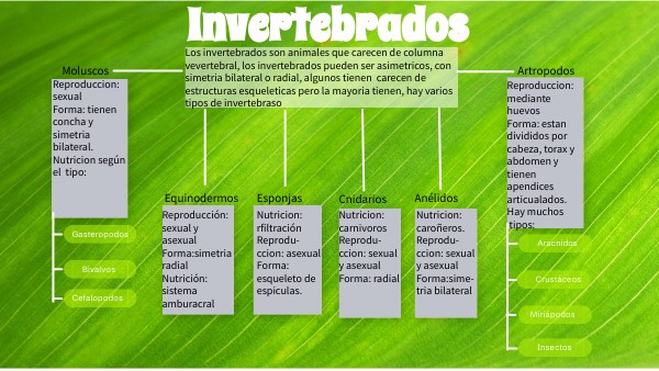 Los invertebrados son animales que carecen de columna vevertebral, los invertebrados pueden ser asimetricos, con simetria bilateral o radial, algunos tienen carecen de estructuras esqueleticas pero la mayoria tienen, hay varios tipos de invertebraso