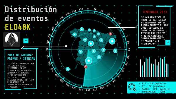 SE HAN ANALIZADO UN TOTAL DE 373 TORNEOS DE WARHAMMER 40K EN ESPAÑA DURANTE EL AÑO 2023. DE ELLOS UN TOTAL de 35 FUERON EVENTOS POR EQUIPOS, Y 33 DE CATEGORÍA "GRAND TOURNAMENT", 17 "MAJOR" y 3 "SUPERMAJOR" .