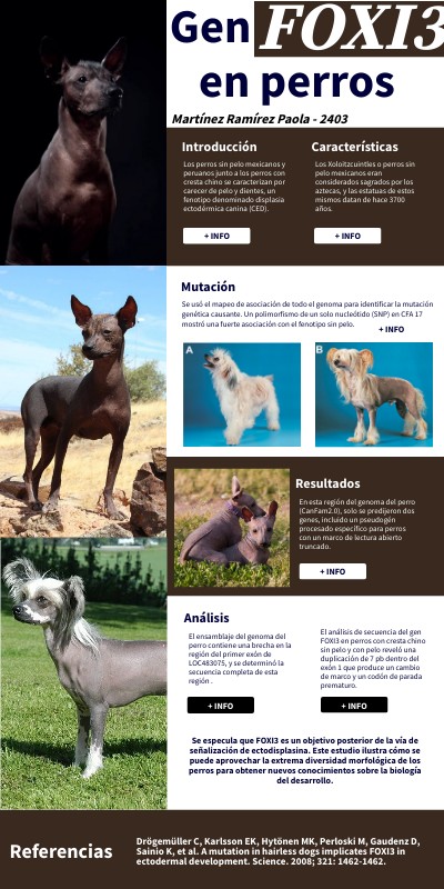 El análisis de secuencia del gen FOXI3 en perros con cresta chino sin pelo y con pelo reveló una duplicación de 7 pb dentro del exón 1 que produce un cambio de marco y un codón de parada prematuro.
