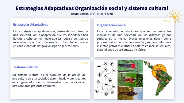 Las estrategias adaptativas son, partes de la cultura de una sociedad.Son la adaptación que las sociedades han llevado a cabo con el medio que les rodea y del tipo de relaciones que han desarrollado tras haber vivido en condiciones de riesgo a lo largo de generaciones