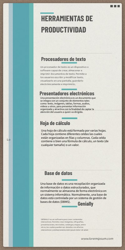GENIALLY es un software para crear contenidos interactivos. Permite crear imágenes, infografías, presentaciones, microsites, catálogos, mapas, entre otros, los cuales pueden ser dotados con efectos interactivos y animacionesLorem ipsum dolor sit amet.