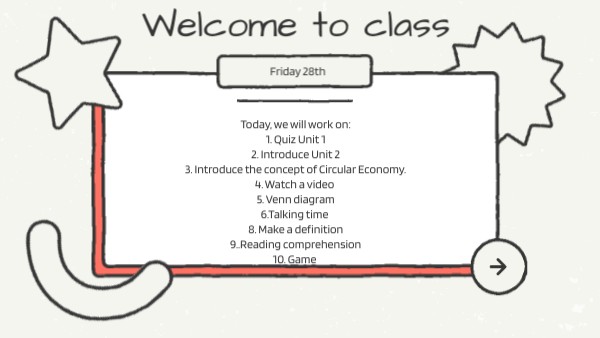 Today, we will work on: 1. Quiz Unit 1 2. Introduce Unit 2 3. Introduce the concept of Circular Economy. 4. Watch a video 5. Venn diagram 6.Talking time 8. Make a definition 9..Reading comprehension 10. Game