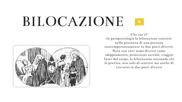 Che cos'è?In parapsicologia la bilocazione consiste nella presenza di una persona contemporaneamente in due posti diversi. Nota con vari nomi diversi come sdoppiamento, proiezione astrale, viaggio fuori dal corpo, la bilocazione seconndo chi la pratica, non solo di sentirsi ma anche di trovarsi in due posti diversi