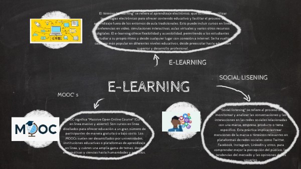 El término "e-learning" se refiere al aprendizaje electrónico, que consiste en utilizar tecnologías electrónicas para ofrecer contenido educativo y facilitar el proceso de aprendizaje fuera de los entornos de aula tradicionales. Esto puede incluir cursos en línea, conferencias en video, simulaciones interactivas, aulas virtuales y varios otros recursos digitales. El e-learning ofrece flexibilidad y accesibilidad, permitiendo a los estudiantes estudiar a su propio ritmo y desde cualquier lugar con conexión a internet. Se ha vuelto cada vez más popular en diferentes niveles educativos, desde preescolar hasta educación superior y desarrollo profesional.