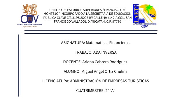 ASIGNATURA: Matematicas Financieras TRABAJO: ADA INVERSA DOCENTE: Ariana Cabrera Rodriguez ALUMNO: Miguel Angel Ortiz Chulim LICENCIATURA: ADMINISTRACIÓN DE EMPRESAS TURISTICAS CUATRIMESTRE: 2° “A”