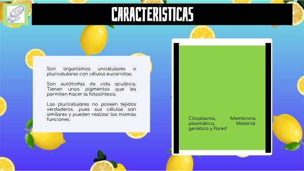 Son organismos unicelulares o pluricelulares con células eucariotas. Son autótrofas de vida acuática. Tienen unos pigmentos que les permiten hacer la fotosíntesis. Las pluricelulares no poseen tejidos verdaderos. pues sus células son similares y pueden realizar las mismas funciones.