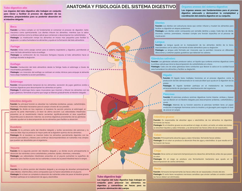 Función: El hígado tiene múltiples funciones en el proceso digestivo, como la producción de bilis (almacenada en la vesícula biliar) que ayuda en la digestión de las grasas. Fisiología: El hígado también participa en el metabolismo de nutrientes, almacenamiento de glucógeno y desintoxicación del organismo.