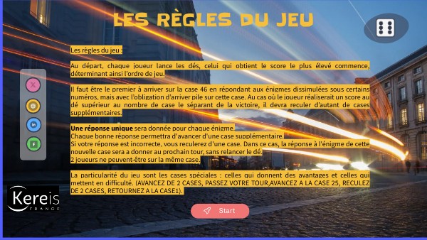 Les règles du jeu : Au départ, chaque joueur lance les dés, celui qui obtient le score le plus élevé commence, déterminant ainsi l’ordre de jeu. Il faut être le premier à arriver sur la case 46 en répondant aux énigmes dissimulées sous certains numéros, mais avec l’obligation d’arriver pile sur cette case. Au cas où le joueur réaliserait un score au dé supérieur au nombre de case le séparant de la victoire, il devra reculer d’autant de cases supplémentaires. Une réponse unique sera donnée pour chaque énigme. Chaque bonne réponse permettra d'avancer d'une case supplémentaire. Si votre réponse est incorrecte, vous reculerez d'une case. Dans ce cas, la réponse à l'énigme de cette nouvelle case sera a donner au prochain tour, sans relancer le dé. 2 joueurs ne peuvent-être sur la même case. La particularité du jeu sont les cases spéciales : celles qui donnent des avantages et celles qui mettent en difficulté. (AVANCEZ DE 2 CASES, PASSEZ VOTRE TOUR,AVANCEZ A LA CASE 25, RECULEZ DE 2 CASES, RETOURNEZ A LA CASE1).