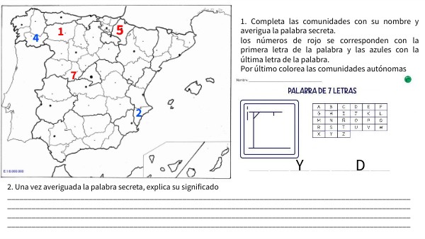 1. Completa las comunidades con su nombre y averigua la palabra secreta. los números de rojo se corresponden con la primera letra de la palabra y las azules con la última letra de la palabra. Por último colorea las comunidades autónomas