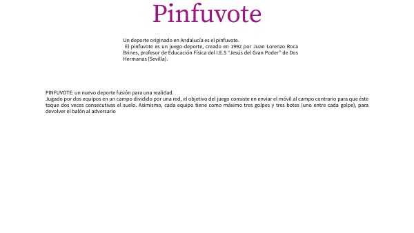 Un deporte originado en Andalucía es el pinfuvote. El pinfuvote es un juego-deporte, creado en 1992 por Juan Lorenzo Roca Brines, profesor de Educación Física del I.E.S “Jesús del Gran Poder” de Dos Hermanas (Sevilla).