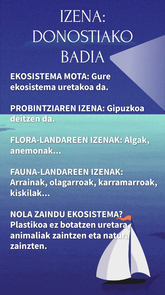 EKOSISTEMA MOTA: Gure ekosistema uretakoa da. PROBINTZIAREN IZENA: Gipuzkoa deitzen da. FLORA-LANDAREEN IZENAK: Algak, anemonak... FAUNA-LANDAREEN IZENAK: Arrainak, olagarroak, karramarroak, kiskilak... NOLA ZAINDU EKOSISTEMA?Plastikoa ez botatzen uretara, animaliak zaintzen eta natura zainzten.