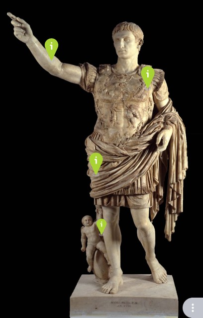 La lorica, una corazza in cuoio tipica dei legionari, come il mantello ribadisce il suo status da comandante. In questo caso, però, assume anche un significato allegorico. Infatti è raffigurata la riconsegna delle insegne romane da parte dello sconfitto re dei Parti.