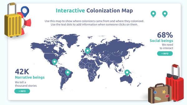 Use this map to show where colonizers came from and where they colonized. Use the teal dots to add information when someone clicks on them.