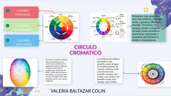 Primarios: rojo, amarillo y azul. Secundarios: naranja, verde, y púrpura, violeta o morado. Terciarios: rojo naranja, ámbar o amarillo naranja, verde amarillo o chartreuse, azul verde o turquesa, azul púrpura o violeta y rojo púrpura.