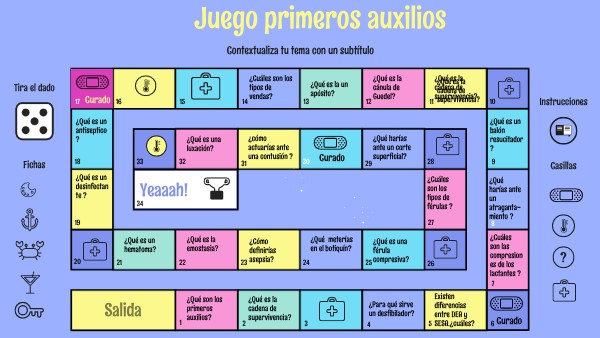 Partiendo desde la casilla de salida, tendréis que ir tirando el dado y respondiendo a todas las preguntas. Cuando la respuesta sea incorrecta, pasará vuestro turno y tendréis que pensarlo para más tarde. El equipo ganador será el que consiga llegar a la casilla de llegada. ¡Mucha suerte!