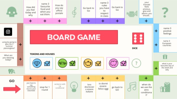 Each player must choose a color: blue, green, yellow or pink. He/she gets a tile to mark his/her position and 10 houses to indicate the properties he/she acquires during the game. Each player must take the tile of his/her color and place it on the starting square. To start playing, click on the dice and move your piece to the corresponding square. In each square there must be one or more questions. If you get it right, place one of your houses on that square - congratulations, you have a new property! Special squares: the squares with icons contain penalties such as "Player pays electricity tax: loses 2 houses". Get the question right to avoid the penalty! The player who has the highest number of houses on the board once all the squares are occupied wins.