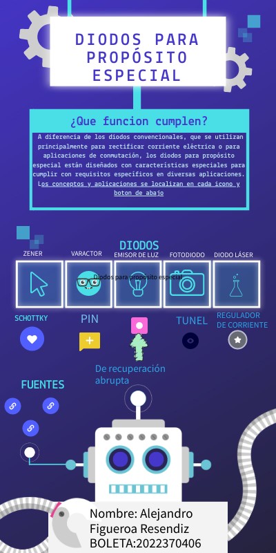 A diferencia de los diodos convencionales, que se utilizan principalmente para rectificar corriente eléctrica o para aplicaciones de conmutación, los diodos para propósito especial están diseñados con características especiales para cumplir con requisitos específicos en diversas aplicaciones.Los conceptos y aplicaciones se localizan en cada icono y boton de abajo