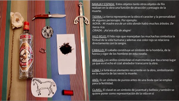 NAVAJA Y ESPADA: Estos objetos tanto otros objetos de filo realizan en la obra una función de atracción y presagio de la muerte.