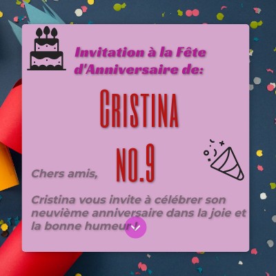 Chers amis, Cristina vous invite à célébrer son neuvième anniversaire dans la joie et la bonne humeur !