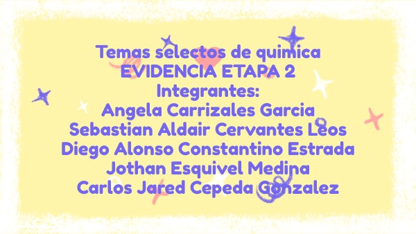 Temas selectos de quimica EVIDENCIA ETAPA 2 Integrantes: Angela Carrizales Garcia Sebastian Aldair Cervantes Leos Diego Alonso Constantino Estrada Jothan Esquivel Medina Carlos Jared Cepeda Gonzalez