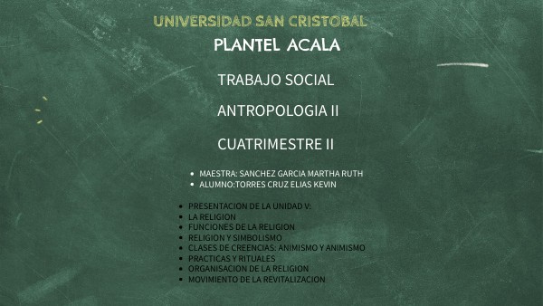 en el siguiente trabajo conoceremos el significado de religion y cada una de sus funciones que la conforman que no solo tiene una funcion que al igual tiene un simbolismo, tambien las clases de creencias las cuales serian el animismo y el antimismo que las dos tienen una relacion comun , al igual existen las practicas y rituales la organisacion de la religional al gual que el movimiento de la revitalizacion.