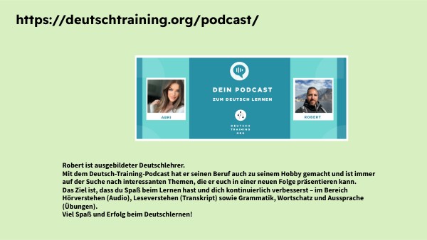 Robert ist ausgebildeter Deutschlehrer. Mit dem Deutsch-Training-Podcast hat er seinen Beruf auch zu seinem Hobby gemacht und ist immer auf der Suche nach interessanten Themen, die er euch in einer neuen Folge präsentieren kann. Das Ziel ist, dass du Spaß beim Lernen hast und dich kontinuierlich verbesserst – im Bereich Hörverstehen (Audio), Leseverstehen (Transkript) sowie Grammatik, Wortschatz und Aussprache (Übungen). Viel Spaß und Erfolg beim Deutschlernen!