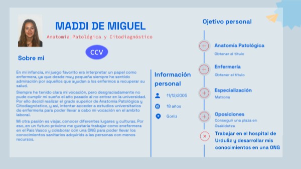 En mi infancia, mi juego favorito era interpretar un papel como enfermera, ya que desde muy pequeña siempre he sentido admiración por aquellos que ayudan a los enfermos a recuperar su salud.Siempre he tenido clara mi vocación, pero desgraciadamente no pude cumplir mi sueño el año pasado al no entrar en la universidad. Por ello decidí realizar el grado superior de Anatomía Patológica y Citodiagnóstico, y así, intentar acceder a estudios universitarios de enfermería para poder llevar a cabo mi vocación en el ambito laboral. Mi otra pasión es viajar, conocer diferentes lugares y culturas. Por eso, en un futuro próximo me gustaría trabajar como enefermera en el País Vasco y colaborar con una ONG para poder llevar los conocimientos sanitarios adquirids a las personas con menos recursos.