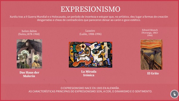 O EXPRESIONISMO NACE EN 1905 EN ALEMAÑA . AS CARACTERÍSTICAS PRINCIPAIS DO EXPRESIONISMO SON, A COR, O DINAMISMO E O SENTIMENTO.