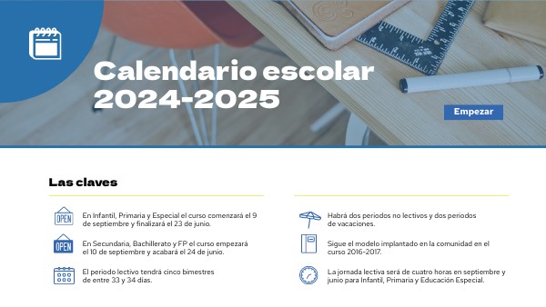 En Secundaria, Bachillerato y FP el curso empezará el 10 de septiembre y acabará el 24 de junio.