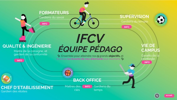 Pédago Mise en place, pilotage et animation des sessions de CERTIFICATIONS Copilote EXB En charges des bulletins de notes, livrets scolaires, dossiers pros … Relais entre infos pédago Certif et Responsables Pédago. / Formateurs Administratif Inscriptions administratives (et désinscriptions) des alternants aux CERTIFS Suivi des étapes de l'offre de formation et des livrables attendus concernant les formations certifiantes proposées par l’IFCV Suivi des enquêtes alternants (Satisfactions, enquêtes partenaires…) Support Support de l’équipe backoffice (participation aux grandes étapes : EXB, rentrées, comités …) … et plus largement support de l’équipe pédago.