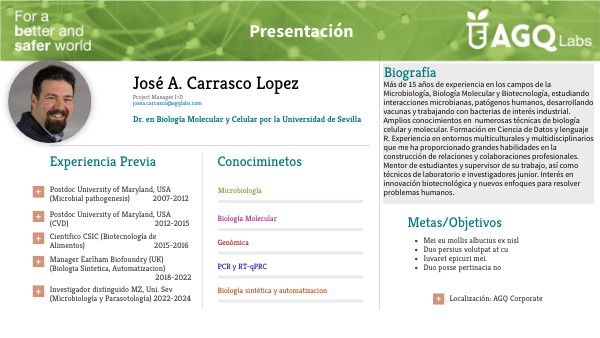 Más de 15 años de experiencia en los campos de la Microbiología, Biología Molecular y Biotecnología, estudiando interacciones microbianas, patógenos humanos, desarrollando vacunas y trabajando con bacterias de interés industrial. Amplios conocimientos en numerosas técnicas de biología celular y molecular. Formación en Ciencia de Datos y lenguaje R. Experiencia en entornos multiculturales y multidisciplinarios que me ha proporcionado grandes habilidades en la construcción de relaciones y colaboraciones profesionales. Mentor de estudiantes y supervisor de su trabajo, así como técnicos de laboratorio e investigadores junior. Interés en innovación biotecnológica y nuevos enfoques para resolver problemas humanos.