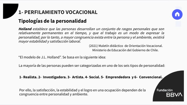 1- Realista. 2- Investigadora. 3- Artista. 4- Social. 5- Emprendedora y 6- Convencional.