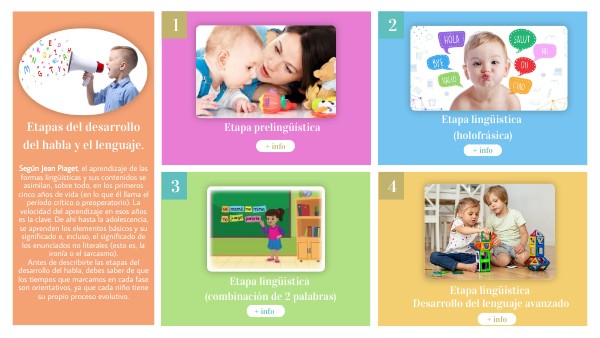 Según Jean Piaget, el aprendizaje de las formas lingüísticas y sus contenidos se asimilan, sobre todo, en los primeros cinco años de vida (en lo que él llama el período crítico o preoperatorio). La velocidad del aprendizaje en esos años es la clave. De ahí hasta la adolescencia, se aprenden los elementos básicos y su significado e, incluso, el significado de los enunciados no literales (esto es, la ironía o el sarcasmo). Antes de describirte las etapas del desarrollo del habla, debes saber de que los tiempos que marcamos en cada fase son orientativos, ya que cada niño tiene su propio proceso evolutivo.