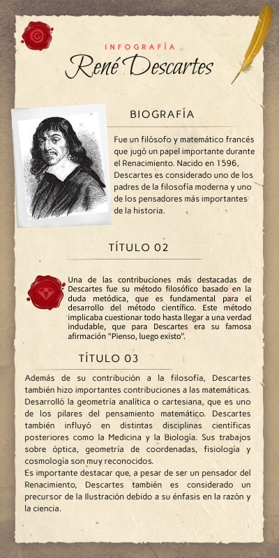 Fue un filósofo y matemático francés que jugó un papel importante durante el Renacimiento. Nacido en 1596, Descartes es considerado uno de los padres de la filosofía moderna y uno de los pensadores más importantes de la historia.