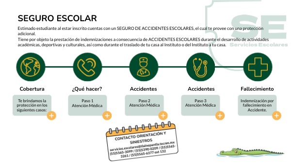 Estimado estudiante al estar inscrito cuentas con un SEGURO DE ACCIDENTES ESCOLARES, el cual te provee con una protección adicional. Tiene por objeto la prestación de indemnizaciones a consecuencia de ACCIDENTES ESCOLARES durante el desarrollo de actividades académicas, deportivas y culturales, así como durante el traslado de tu casa al Instituto o del Instituto a tu casa.