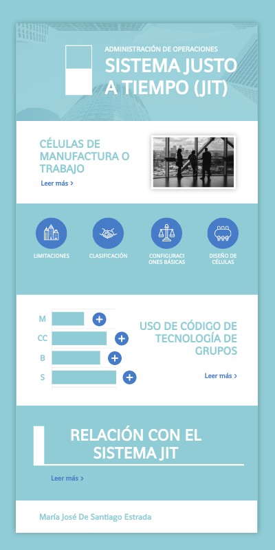 Células de manufactura o trabajoJIT reduce los niveles de inventarios para obtener el control de los costos; entiende y disminuye los costos al utilizar sentido común y procedimientos sencillos, de esa forma corta atajos de todo aquello que no es necesario. Su principal finalidad es mejorar la capacidad de la empresa para responder económicamente hablando al cambio. Tecnología por grupos Dentro de la producción, JIT organiza la fabrica físicamente no por funciones sino por productos. La maquinaria se debe dedicar total o parcialmente a una familia de productos y debe disponer en el orden que va a cumplir la familia de productos. Es decir, tanto JIT como TG busca que dentro del proceso de fabricación de una pieza terminada, esta debe pasar a la siguiente celda y así consecutivamente manteniendo el flujo de trabajo de una forma constante.