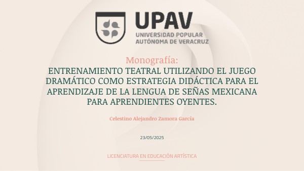 Esta monografía propone integrar el entrenamiento teatral y el juego dramático como estrategia didáctica, permitiendo que los estudiantes oyentes desarrollen habilidades expresivas y comunicativas en LSM.