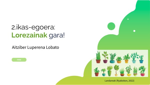 - 2.KE - LA: 2.2.2 Lorezainari bere hipotesiak adierazten dizkio, jakin nahia erakutsiz. 2.3.1 Landareen ezaugarriak, beharrizanak eta bitxikeriak azaltzen ditu, idatziz.