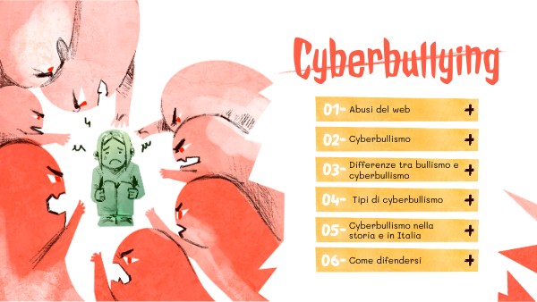 Cyberbullismo: -Possono essere coinvolti ragazzi ed adulti di tutto il mondo; -chiunque, anche chi è vittima nella vita reale, può diventare cyberbullo; -i cyberbulli possono essere anonimi e sollecitare la partecipazione di altri "amici" anonimi, in modo che la persona non sappia con chi sta interagendo; -il materiale utilizzato per azioni di cyberbullismo può essere diffuso in tutto il mondo; -le comunicazioni aggressive possono avvenire 24 ore su 24; -i cyberbulli hanno ampia liberta nel poter fare online ciò che non potrebbero fare nella vita reale; -percezione di invisibilità da parte del cyberbullo attraverso azioni che si celano dietro la tecnologia; -assenza di reazioni visibili da parte della vittima che non consentono al cyberbullo di vedere gli effetti delle proprie azioni; -sdoppiamento della personalità: le conseguenze delle proprie azioni vengono attribuite al "profilo utente" creato.