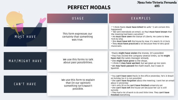 • “I think Paolo must have killed his wife.” (I am certain this happened) • “We sent everybody an email, so Paul must have known that the meeting had been cancelled.” • He must have seen the Statue of Liberty. He came to New York by ship. • She must have left the house by now; it’s nearly 11 o'clock. • They must have practiced a lot because they’re very good musicians.