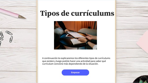 A continuación te explicaremos los diferentes tipos de currículums que existen y luego podrás hacer una actividad para saber qué currículum conviene más dependiendo de la situación.