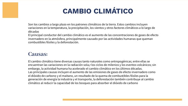 El cambio climático tiene diversas causas tanto naturales como antropogénicas; entre ellas se encuentran las variaciones en la radiación sola,r los ciclos de milenios y los eventos volcánicos; sin embargo, la actividad humana ha acelerado el cambio climático en los últimos décadas. Las principales causas incluyen el aumento de las emisiones de gases de efecto invernadero como el dióxido de carbono y el maitano, un resultado de la quema de combustibles fósiles para la generación de energía la industria y el transporte, la deforestación también contribuye al cambio climático al reducir la capacidad de los bosques para absorber el dióxido de carbono