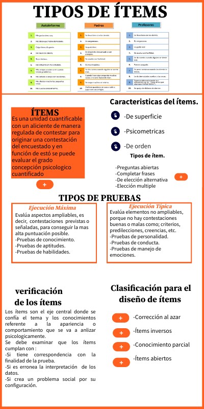 Los ítems son el eje central donde se confía el tema y los conocimientos referente a la apariencia o comportamiento que se va a anlizar psicologicamente.Se debe examinar que los ítems cumplan con : -Si tiene correspondencia con la finalidad de la prueba. -Si es erronea la interpretación de los datos. -Si crea un problema social por su configuración.