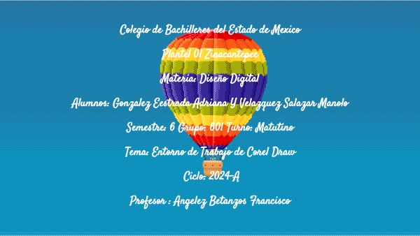 Colegio de Bachilleres del Estado de Mexico Plantel 01 Zinacantepec Materia: Diseño Digital Alumnos: Gonzalez Eestrada Adriana Y Velazquez Salazar Manolo Semestre: 6 Grupo: 601 Turno: Matutino Tema: Entorno de Trabajo de Corel Draw Ciclo: 2024-A Profesor : Angelez Betanzos Francisco