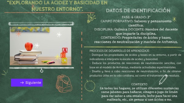 OBJETIVO: Identificar y analizar las características de acidez y basicidad en sustancias de uso cotidiano en el hogar. RECURSOS: Indicadores de pH (papel pH o soluciones de indicadores). Col morada. Muestras de sustancias ácidas y básicas comunes (por ejemplo, vinagre, limón, bicarbonato de sodio, jabón). Papel y bolígrafos/marcadores. Cartulinas o pizarrón. Recursos audiovisuales (opcional). EVALUACIÓN: Registro de observación.
