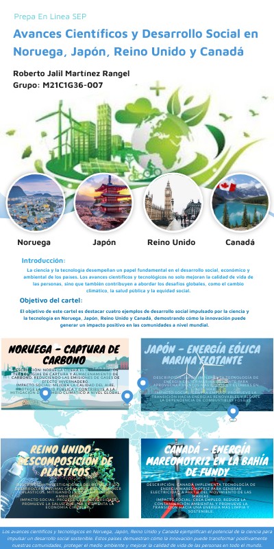 El objetivo de este cartel es destacar cuatro ejemplos de desarrollo social impulsado por la ciencia y la tecnología en Noruega, Japón, Reino Unido y Canadá, demostrando cómo la innovación puede generar un impacto positivo en las comunidades a nivel mundial.