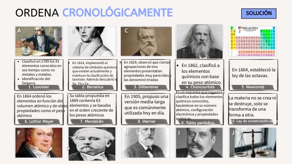 Su tabla propuesta en 1869 contenía 63 elementos y se basaba en el orden creciente de los pesos atómicos