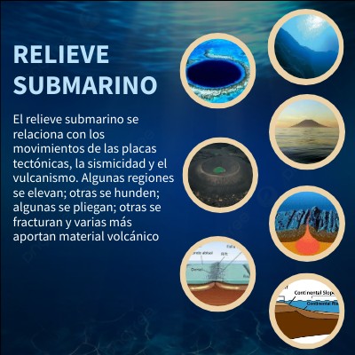 El relieve submarino se relaciona con los movimientos de las placas tectónicas, la sismicidad y el vulcanismo. Algunas regiones se elevan; otras se hunden; algunas se pliegan; otras se fracturan y varias más aportan material volcánico